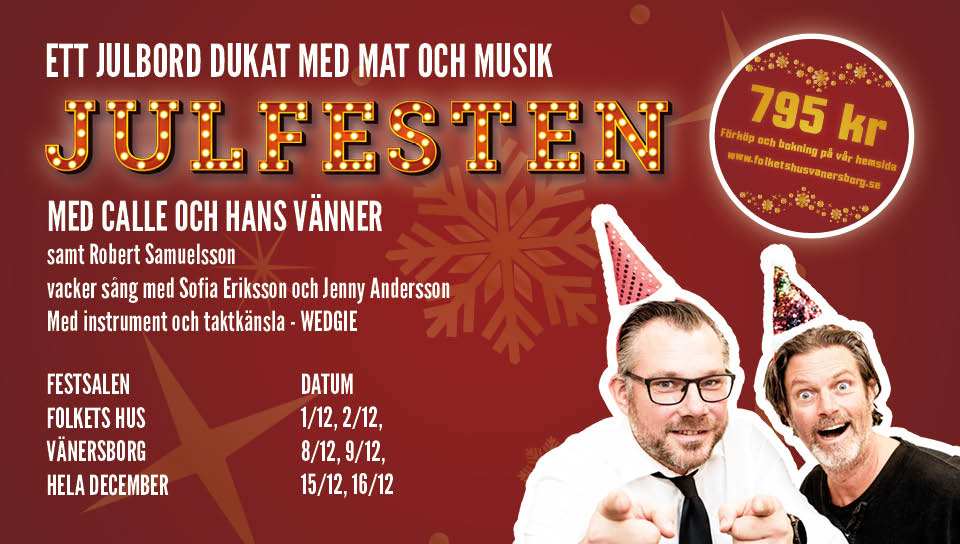 Kontakt EVENEMANG LEDIGA TJÄNSTER Julbord på Folkets Hus Folkets Hus Vänersborg II 12 december Uno - På väg igen Vänersborgs teater II 1 mars Robert Wells - 40 år vid flygeln Vänersborgs teater II 14 mars Vad får det lov att vara till lunch idag? Dagens lunch Maten spelar en viktig roll! meny & bokning Livet är fullt av tillfällen att fira! Vad firar du? Fest & bröllop Välkommen till Folkets Hus i Vänersborg! Vår historia Sociala medier FöljFölj
